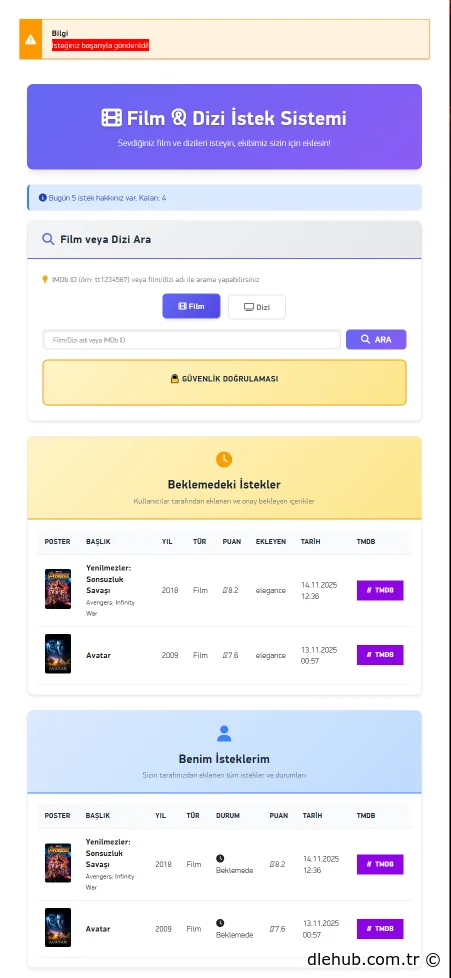 - Film ve Dizi Desteği: Kullanıcılar hem film hem de dizi isteğinde bulunabilir.