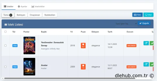 DataLife Engine (DLE) için geliştirilmiş, kullanıcıların sitenize eklenmek üzere film ve dizi isteklerinde bulunmalarını sağlayan güçlü ve zengin özelliklere sahip bir modüldür. Yöneticiler bu istekleri admin panelinden kolayca yönetebilir.