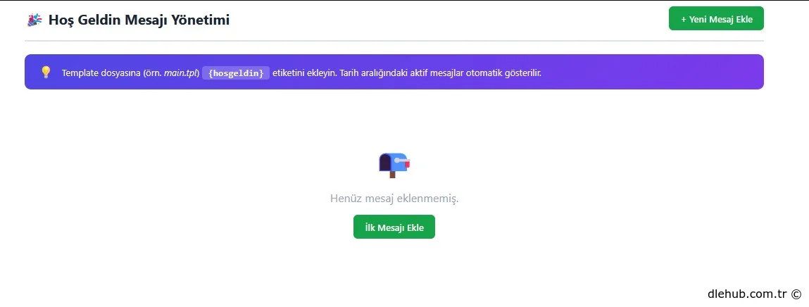 Eklenti, DLE'nin kendi template sistemine entegre olur ve {hosgeldin} etiketi aracılığıyla istediğiniz her template dosyasında kullanılabilir. Kampanya dönemleri, özel günler, duyurular veya kalıcı karşılama mesajları için idealdir.