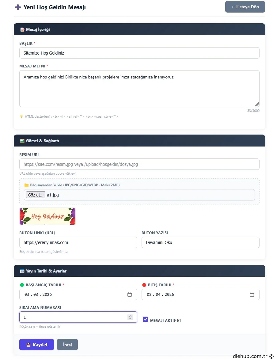 Bilgisayardan JPG, PNG, GIF veya WEBP formatında resim yüklenir. Maksimum 2MB. Dosyalar /upload/hosgeldin/ klasörüne kaydedilir. |