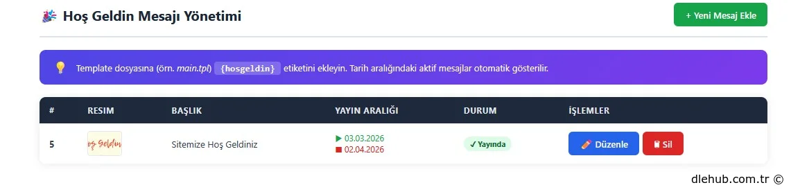 Eklenti, DLE yönetici paneline tamamen entegre bir arayüz sunar. Sol menüde "Hoş Geldin Mesajı" olarak listelenir ve şu işlemleri destekler: